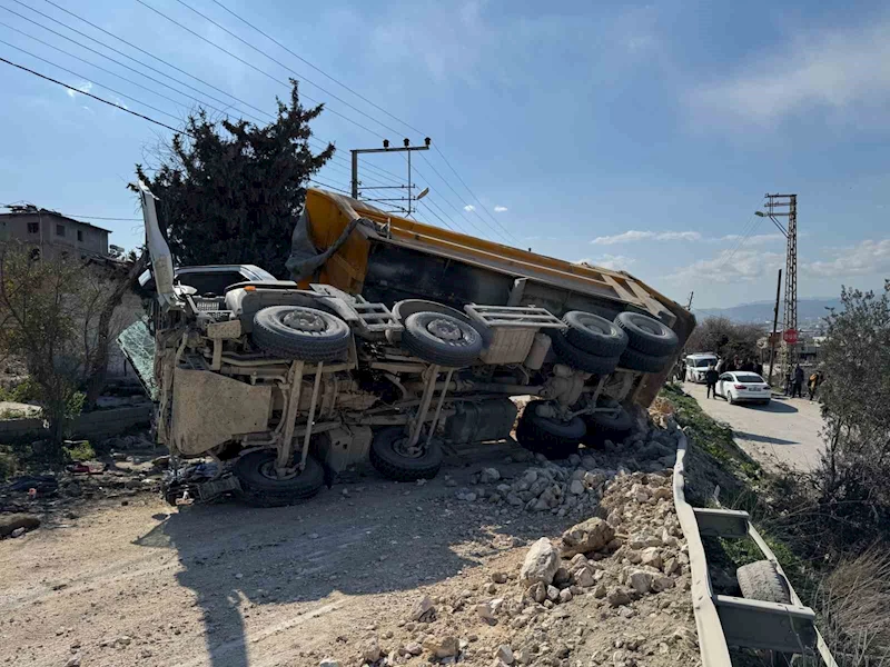 Hatay'da sürücüsünün kontrolünden çıkarak devrilen hafriyat kamyonunun sürücüsü yaralandı.