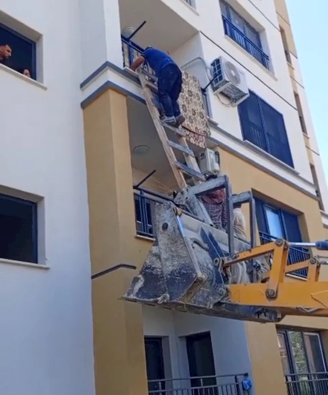 Adana'da çöp dökmek için sokağa çıkan kadının bebeği evde mahsur kalınca iş makinesi yardımıyla kurtarıldı.