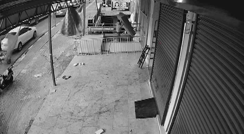 Hatay'da bir iş yerinin önünde bulunan rafın fırtınanın etkisiyle devrildiği esnada rafın altında kalmaktan saniyelerle kurtulan çocuğun o anları kameraya yansıdı.