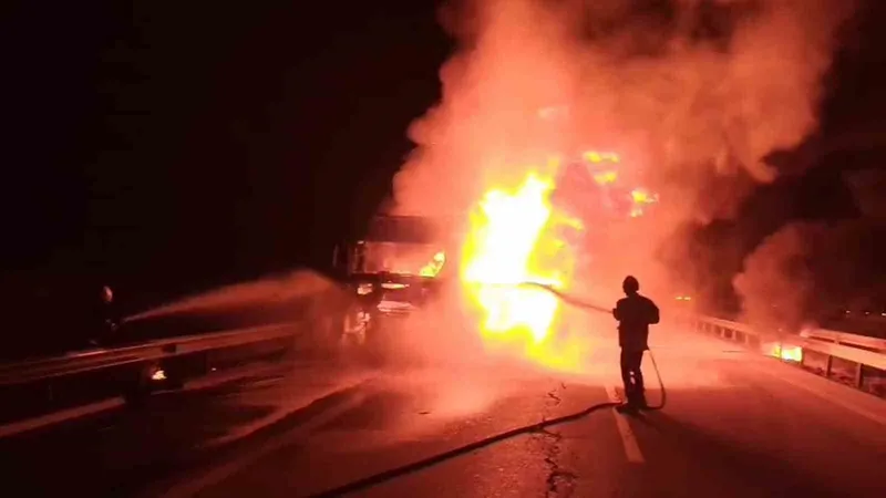 Yangın, gece saatlerinde Erzin Organize Sanayi Bölgesi'nde yaşandı. Seyir halindeki tır alevlere teslim olarak yanmaya başladı. Kısa sürede alevlerin yükseldiği tıra itfaiye ekipleri müdahale etti. Ekiplerin müdahalesiyle kontrol altına alınan alevler, dorse kısmına sirayet etmeden söndürüldü. Yangında can kaybı ve yaralanma yaşanmazken tır kullanılmaz hale geldi.