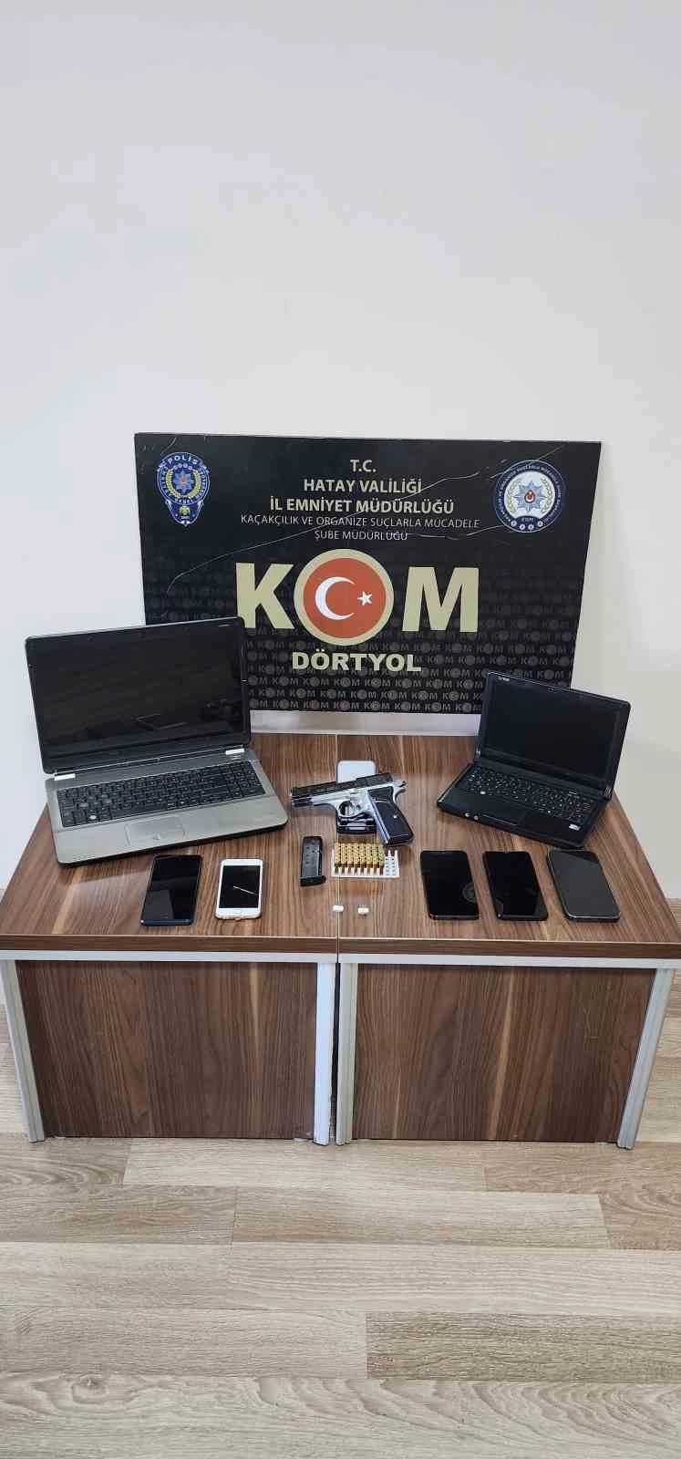 Hatay Emniyet Müdürlüğü ekipleri kentte asayişi ve huzuru sağlamak amacıyla çalışmalarını aralıksız sürdürüyor. Polis ekiplerinin kaçakçılık ve organize suçlarla mücadele çalışmaları kapsamında 25 Şubat günü; 11 adet sahte olduğu değerlendirilen MTS Giriş Belgesi, 6 adet dizüstü bilgisayar, 3 adet kaşe, 2 adet harddisk, 5 adet flash Bellek, 1 adet yazıcı, 230 bin TL para, 11 adet kart, 1 adet pos cihazı, 3 adet ajanda, 5 adet hesap tutulan not kağıdı, 1 adet ruhsatsız tabanca, 40 adet fişek, 5 adet cep telefonu ve 80 bin det gümrük kaçağı boş makaron ele geçirildi. Yapılan uygulamalarda 9 şahsa işlem yapıldı.