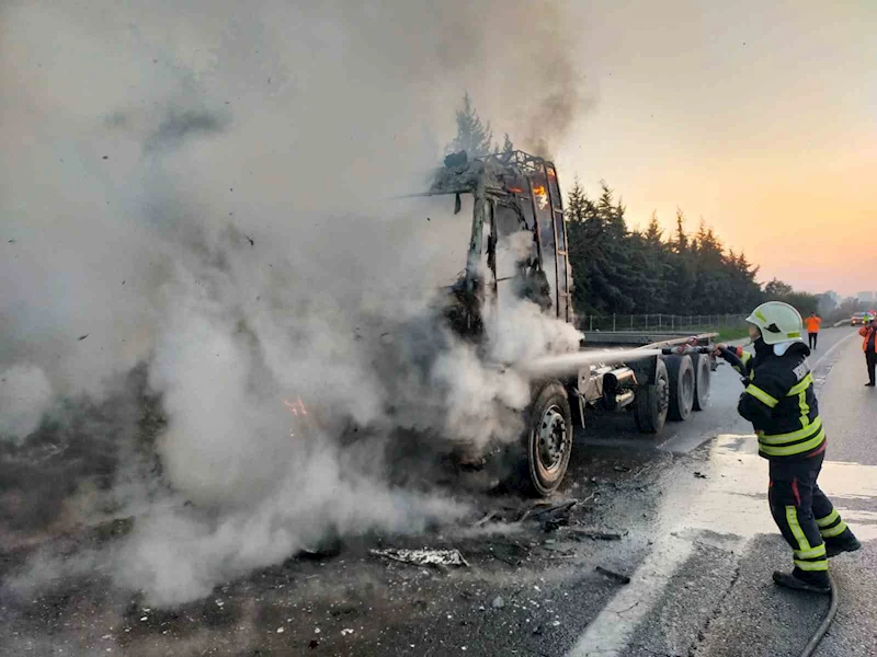Mersin’in Tarsus ilçesinde seyir halindeki kamyonda yangın çıktı. İtfaiye ekiplerinin söndürdüğü yangında kamyonun kupa bölümü kullanılamaz hale geldi.