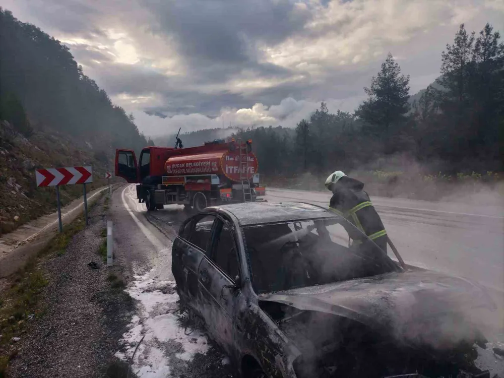 Burdur'un Bucak ilçesinde, Antalya-Isparta Karayolu'nun Elsazı Köyü mevkiinde seyir halindeki bir araçta yangın çıktı. 07 ACU 706 plakalı araç, henüz belirlenemeyen bir nedenle aniden yanmaya başladı.