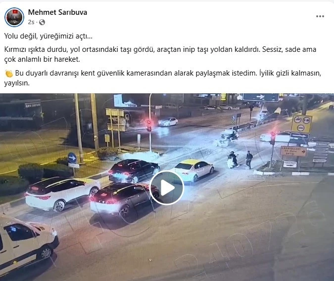 Sosyal medya hesabı üzerinden görüntüyü paylaşan İl Emniyet Müdürü Sarıbuva, "Yolu değil, yüreğimizi açtı. Kırmızı ışıkta durdu, yol ortasındaki taşı gördü, araçtan inip taşı yoldan kaldırdı. Sessiz, sade ama çok anlamlı bir hareket. Bu duyarlı davranışı kent güvenlik kamerasından alarak paylaşmak istedim. İyilik gizli kalmasın, yayılsın" notuyla görüntüyü paylaştı.
